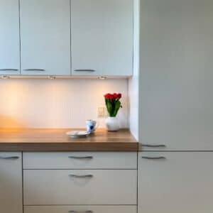 Med vores koncept "Nyt køkken på 1 dag" kan du spise morgenmad i dit gamle køkken og aftensmad i dit nye køkken på den samme dag. Vi skifter skuffer, bordplade og fronter på 1 dag. Det er en stor fordel for dig, og du undgår en lang arbejdsproces.